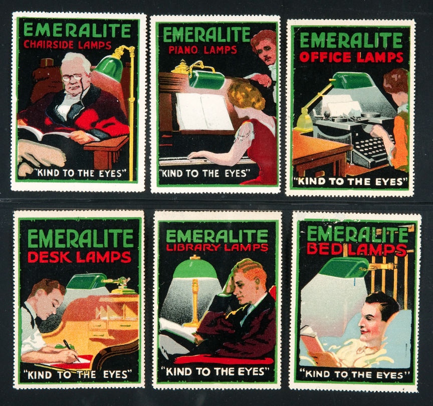 오리지널 유리 전등갓에는 데칼/스티커 또는 잉크 스탬프 형태의 서명도 있습니다. 데칼은 일반적으로 전등갓 뒷면에 있으며 베이지/노란색과 빨간색 원이 있으며 에메랄라이트 로고가 굵은 녹색 글자로 쓰여 있습니다.