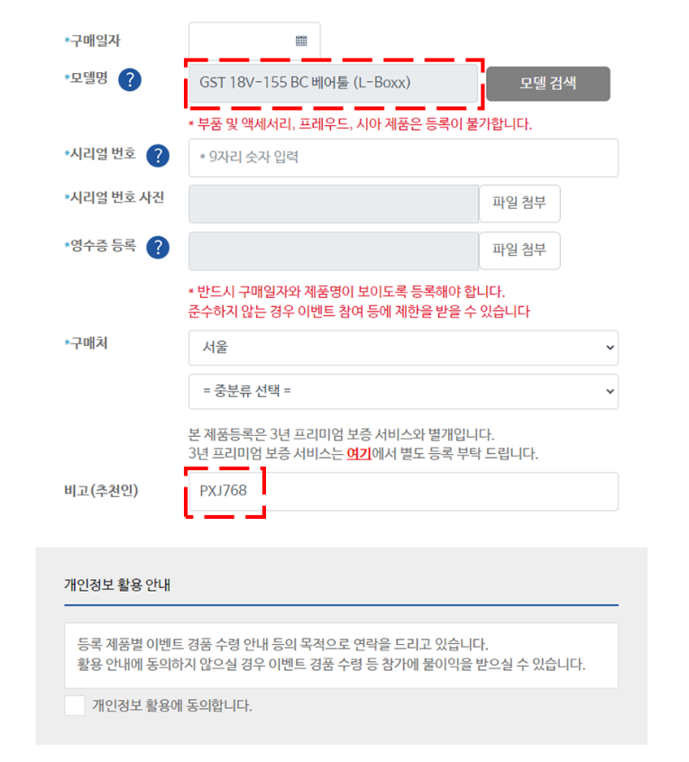 보쉬 홈페이지에서 멤버십 제품 등록 시, 추천인 등록(PXJ768)을 하면 1만원 상품권이 증정됩니다.