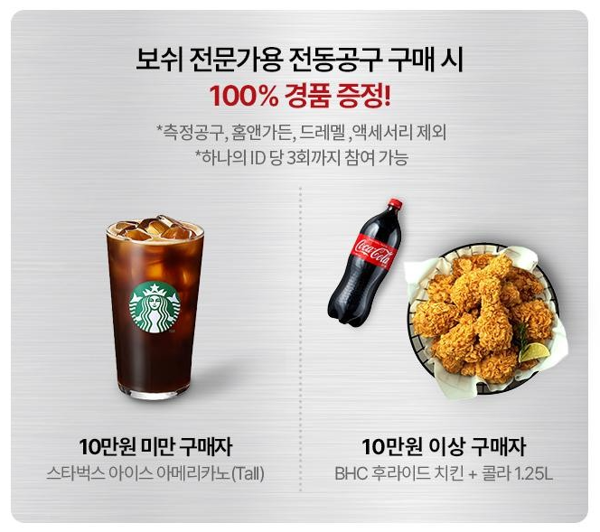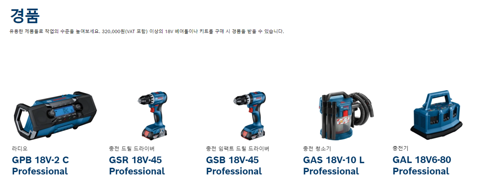 보쉬 충전직쏘를 구매하시면, 4가지 이벤트의 경품이 100% 증정됩니다.