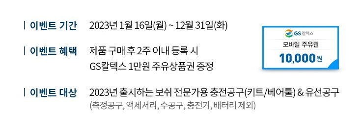 2023년 출시된 보쉬의 신제품을 구매하시면, GS칼텍스 1만원 주유상품권을 100% 증정합니다.