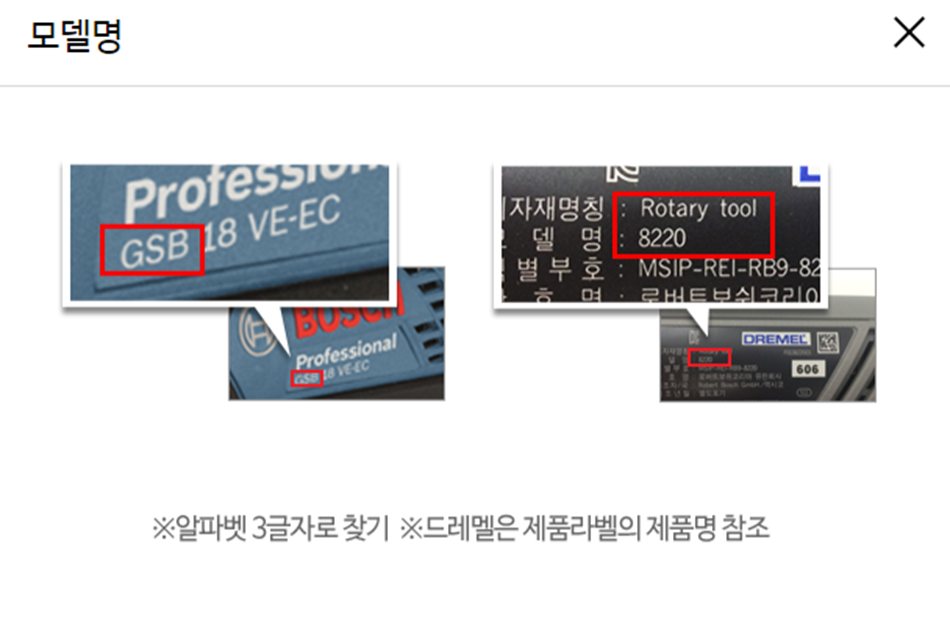 모델명은 제품 박스에 쓰여있는 알파벳 3글자를 찾으시면 검색이 쉽습니다.